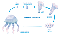 Jellyfish have a complex life cycle that involves the alternation of a sexual (medusa) and an asexual (polyp) generation. The adult medusa is a sexually mature individual that swims freely in the sea. Males produce sperm and females produce eggs; after fertilization, a zygote is formed, which develops into a planula.